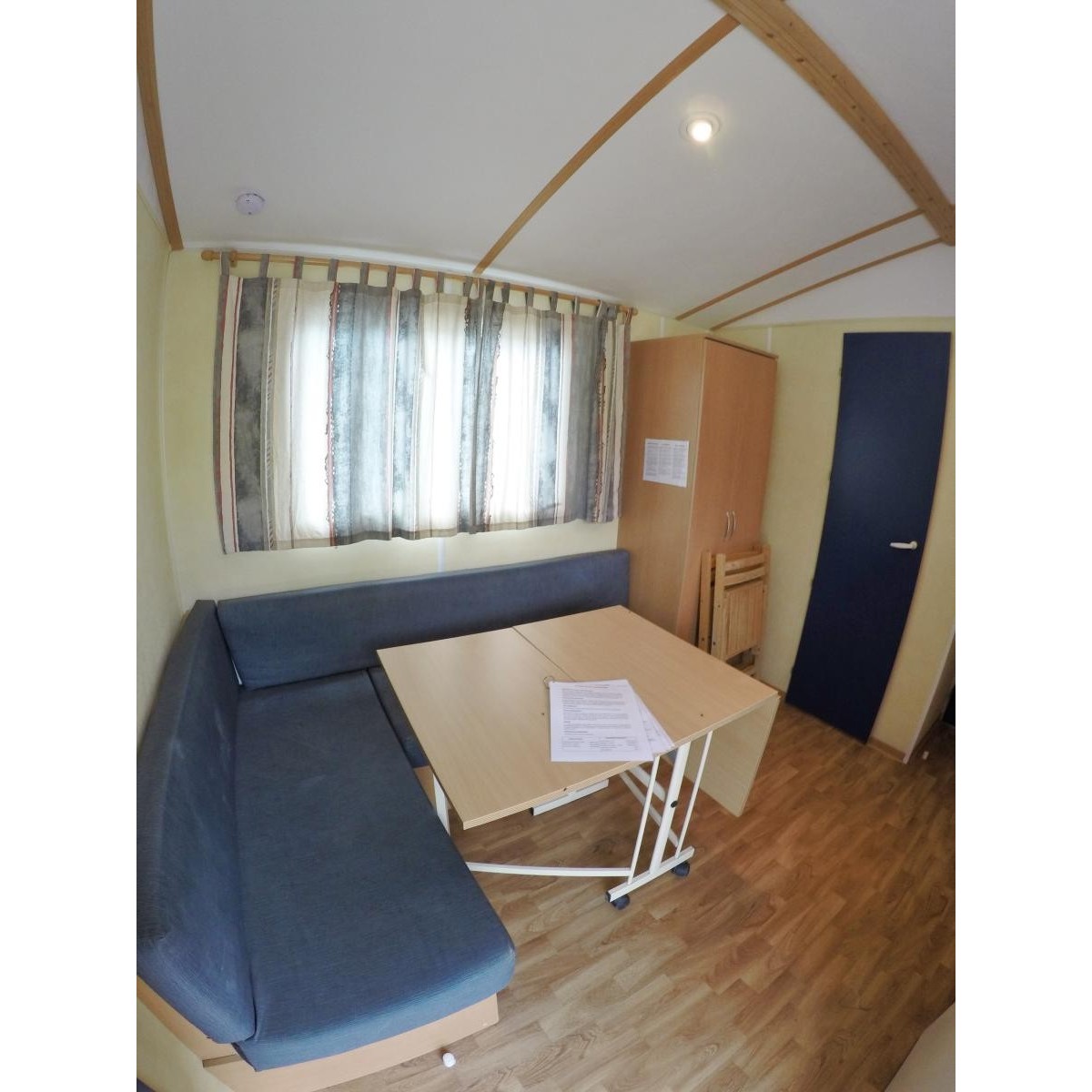 Modelo para 4 personas con una capacidad para 6. Con 2 habitaciones y un comedor con sofá-cama. Baño estilo francés. La segunda habitación con dos camas. Cocina y calentador de gas, frigorífico, convector eléctrico en el comedor. Instalado en Camping Sol i Fred.