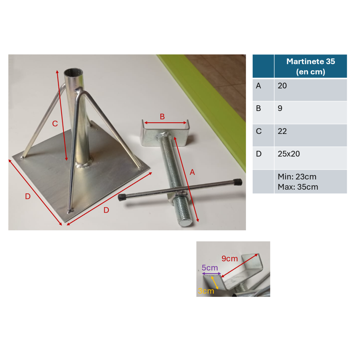 Martinete metálico regulable en altura para mobilhome y caravana. También llamado caballete, gato, borriqueta, nivelador. Base 19cm. Altura desde 25cm a 40cm (dejando 5cm dentro).